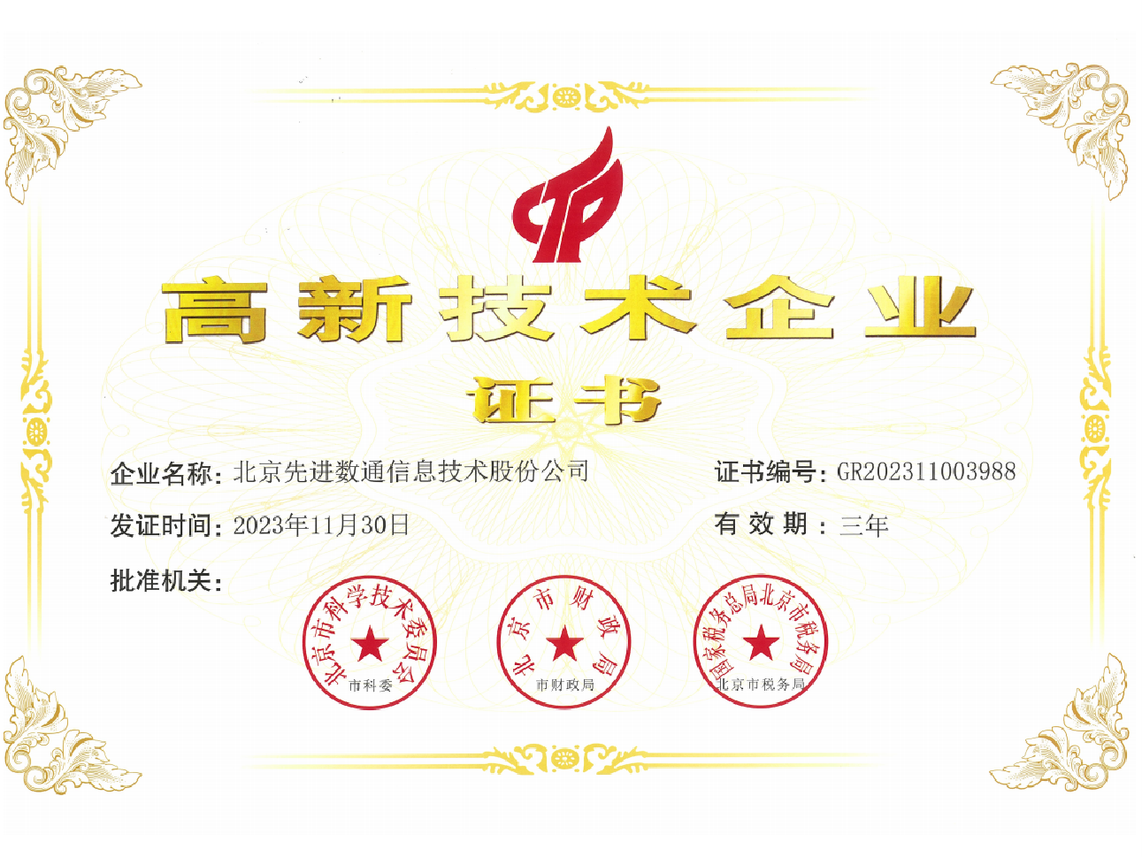• 高新技术企业证书